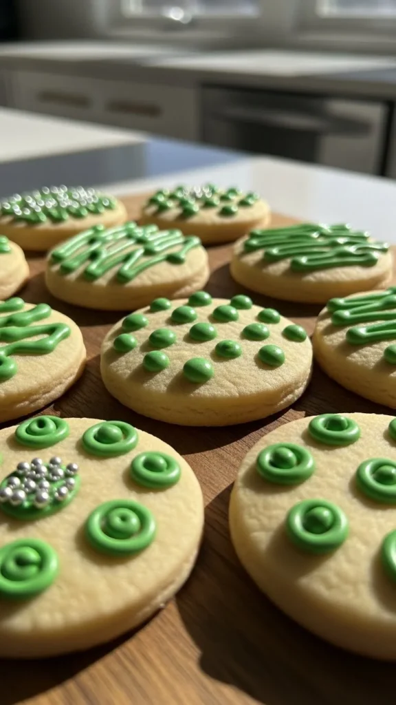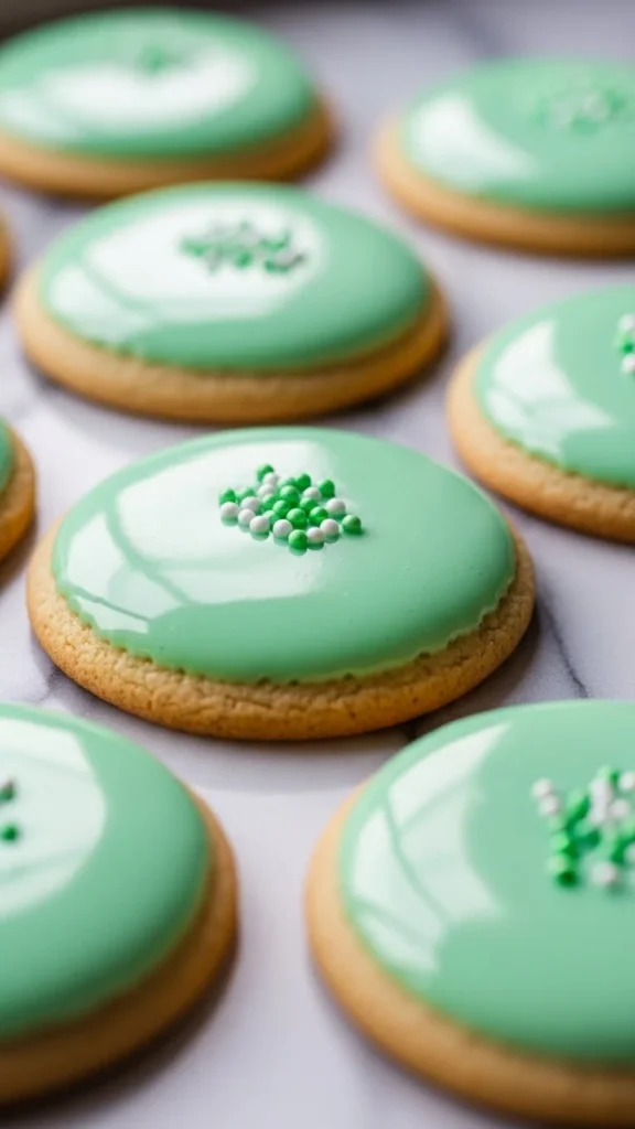 These cookies focus on color and texture rather than complex shapes. Mint green icing gives a fresh seasonal feel. Sprinkles add crunch and visual interest. They’re quick to decorate and great for large batches.