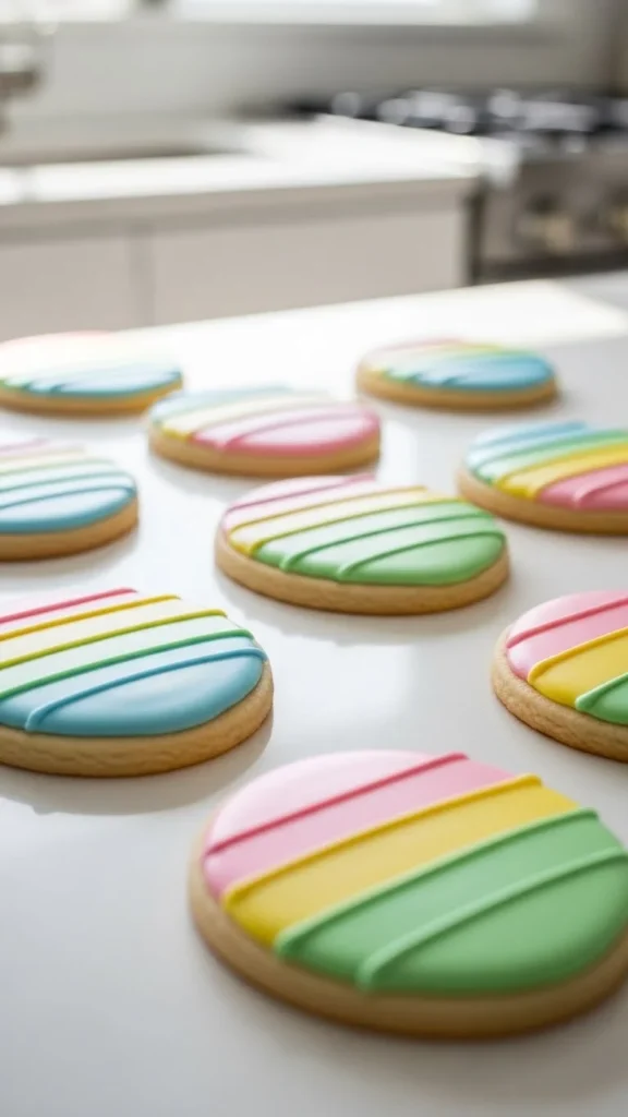 These cookies keep things cheerful with gentle rainbow stripes that feel playful and light. The pastel tones give a softer look than bold colors. Each cookie feels unique due to hand-piped stripes. They’re great for group baking sessions.