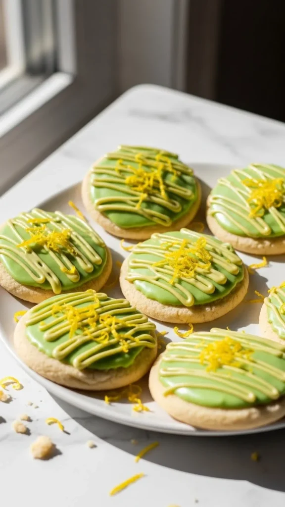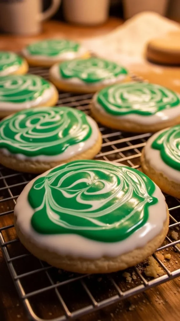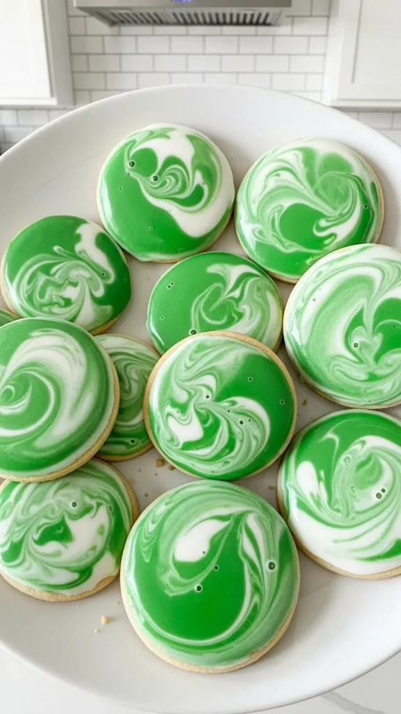 These cookies use a simple marbling technique that looks impressive with little effort. Swirls of green and white create a unique finish on every cookie. The soft sugar cookie base balances the sweet icing well. They feel special without complex steps.