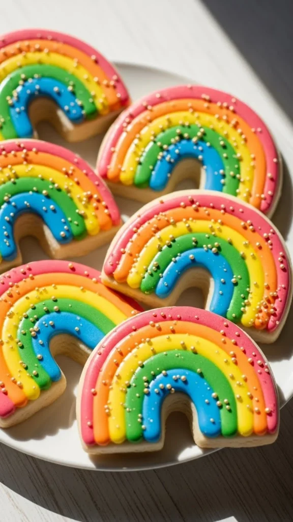 These cookies combine rainbows and gold details into one playful design that instantly feels celebratory. The cookie base stays soft while providing a sturdy surface for layered icing. Gold sprinkles add sparkle without overpowering the look. They’re a fun choice for kids’ parties or colorful dessert tables.