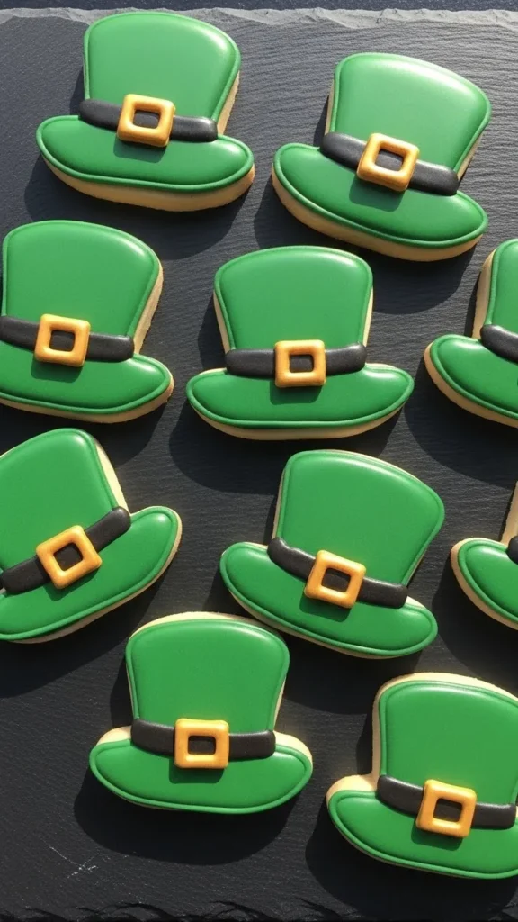 Leprechaun hat cookies instantly set the St Patrick’s Day mood. The bold shape allows for playful color blocking with icing. A gold buckle detail adds personality without extra effort. These cookies feel festive and fun for themed gatherings.