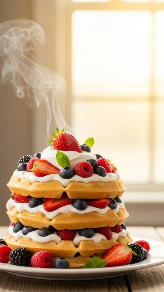 Soft waffles paired with fresh berries and cream.