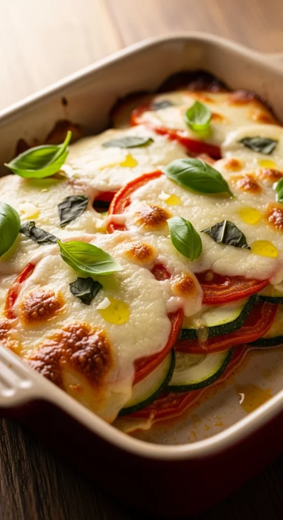 Top with fresh basil and extra parmesan. Add balsamic drizzle if you like. Serve with grilled chicken or salmon. For summer, pair with corn salad. For fall, add sautéed mushrooms on the side.