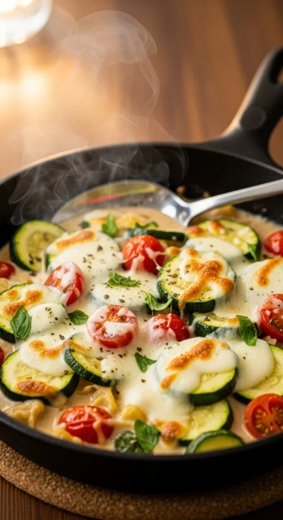 This one-pan skillet gives you the cozy, cheesy vibe of a pasta skillet without relying on a big pot of noodles. Zucchini stands in for that tender bite, and the sauce brings creamy comfort. Tomatoes and herbs keep it bright, and everything cooks quickly in one pan. It’s a great weeknight dinner when you want something warm and satisfying in under 30 minutes. The trick is cooking zucchini just until tender. It’s simple, cozy, and perfect for leftovers.