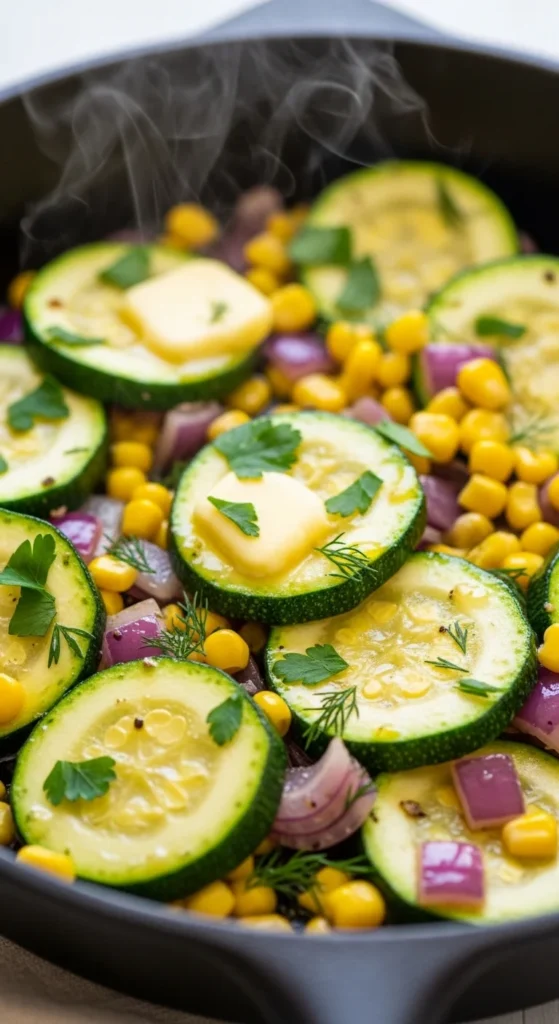 This skillet tastes like peak summer and works great as a quick dinner side or light main with protein. Corn adds sweetness, zucchini adds tenderness, and herbs keep it fresh. It cooks fast and uses simple ingredients you probably already have. It’s also a great “use what you have” recipe when the fridge is full of produce. The trick is cooking zucchini just until tender so it keeps texture. Serve it with grilled chicken or fish. It’s easy, bright, and family-friendly.