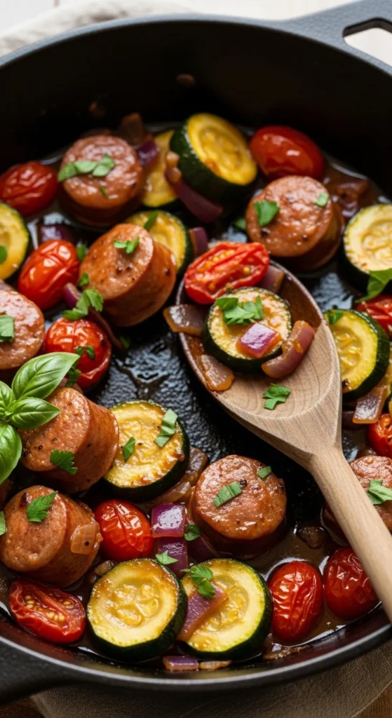 This one-pot dinner is perfect for the moment zucchini season overlaps with cozy fall cravings. Sausage brings rich flavor, zucchini adds tenderness, and tomatoes create a simple sauce that ties everything together. It’s fast, hearty, and great for leftovers. The key is browning sausage first for flavor, then adding zucchini later so it doesn’t get mushy. It’s a great way to use zucchini in a meal that feels warm and filling. Serve it as-is or with a side you love. Simple, comforting, and packed with flavor.